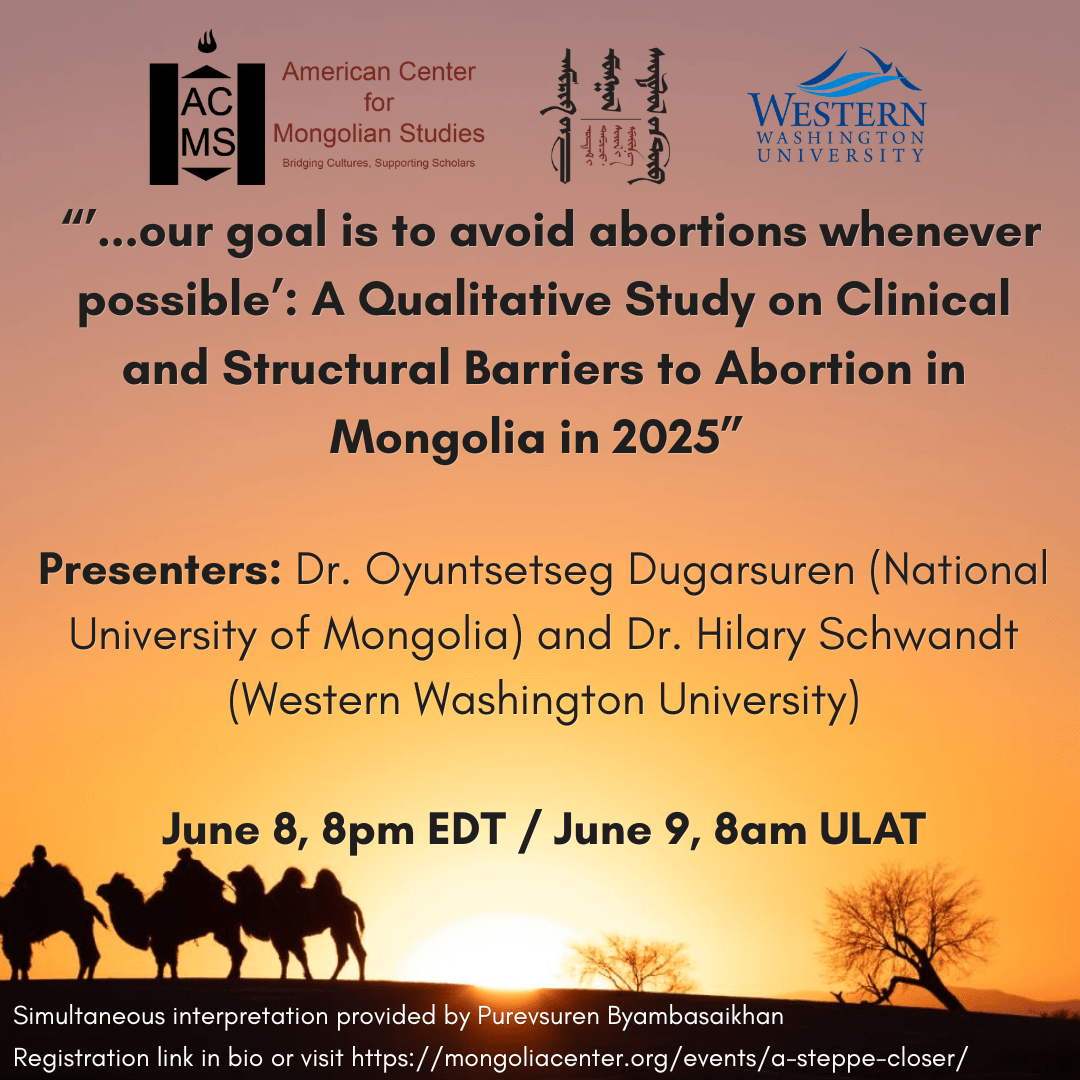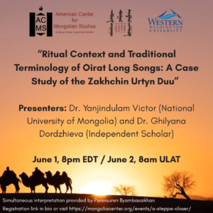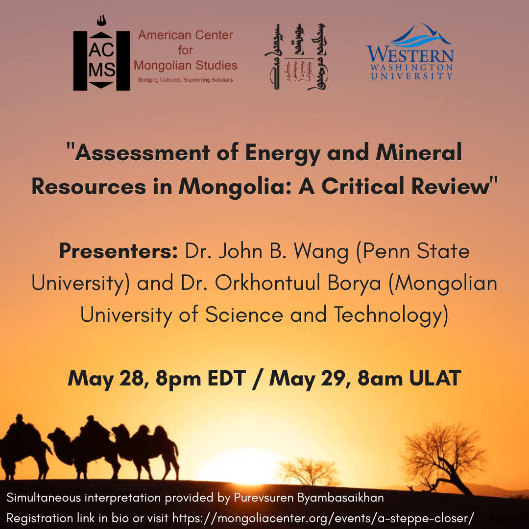 The American Center for Mongolian Studies (ACMS) and the Office of Global Engagement at Western Washington University (WWU) are pleased to announce the second annual panel series in our initiative “Алхам алхмаар дөхөх нь: Хил дамнасан хамтын ажиллагаа ба шинэ мэдлэг бүтээхүй / A Steppe Closer: Cross-Border Collaboration and the Making of New Knowledge.”